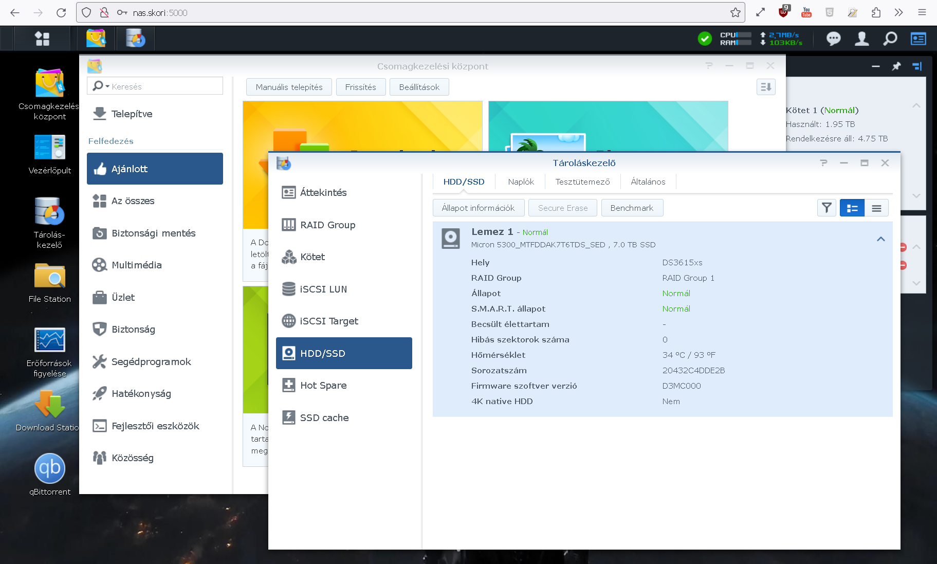 Apróhirdetésben találtam hozzá használt, kevesett futott, 7.68Tb-os szerver SSD-t, ami eddig elég jól bevált.